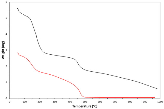 TGA thermograms of the synthesized cis polyacetylene sample under fluxing air (red curve) and nitrogen (black curve).