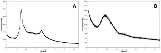 XRD of the starting PVOH (A) and PVOH dehydrated by using sulphuric acid (B).