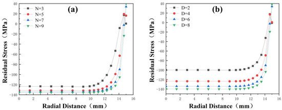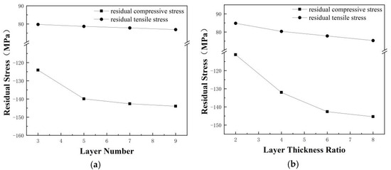 - ANSYS simulation was used to analyze the distribution of residual stresses in SCWA ceramic tool materials as they were lowered from 1700 °C to 25 °C. The results showed that residual compressive stresses were generated in the surface layer of the material, and residual tensile stresses were generated in the matrix layer. With an increase in the number of layers and layer thickness ratio, the residual compressive stress on the surface layer also increases gradually.