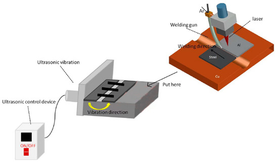 An ultrasonic wave is a kind of mechanical vibration with a frequency higher than 20 kHz [16], which has good directional propagation and high energy density. It can produce cavitation effects, acoustic flow effects, acoustic radiation effects, mechanical vibration effects, and thermal effects in propagation media [17]. These effects can improve the fluidity of the liquid metal in the molten pool to improve its wettability, promote the interdiffusion of atoms to upgrade its metallurgical bond, and break down the dendrite structure during the solidification process to refine grains [18,19]. Hong et al. [20] applied ultrasonic vibration during the friction stir welding process of 6061 Al alloy and 301L stainless steel. The results showed that the interdiffusion of atoms at the interface was promoted under ultrasonic vibration, thereby improving the metallurgical bonding strength of the joint. The tensile strength of the joint was increased by 27.9%. Liu et al. [21] also confirmed that the application of ultrasonic vibration improved the fluidity of metal in the molten pool, which facilitated the escape of pores. Meanwhile, the microstructure of the weld seam was refined, and the IMC thickness at the interface was reduced. These modified the mechanical properties of the joint.