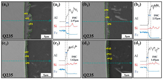 Figure 4a2–d2 shows the element distribution at the Fe/Al interface of the joints with different ultrasound amplitudes. From the steel side to the weld seam, the content of Fe element decreased while the content of Si and Al elements increased. Fe, Si, and Al elements gathered at the interface and reacted to form Al-Fe-Si compounds. No significant difference was observed in element diffusion under different ultrasound amplitudes.