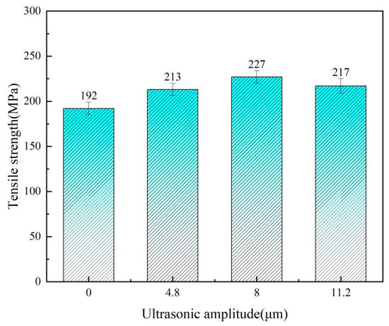 Figure 7 shows the tensile strength of the laser welding-brazing joints under different ultrasonic amplitudes. The tensile strength of the joints without ultrasonic vibration was 192 MPa. The tensile strength of the joints first increased and then decreased slightly, reaching a maximum of 227 MPa when the ultrasonic amplitude was 8.0 μm. The variation trend in the tensile properties was consistent with the microstructure analysis results. The grain size of the weld seam in the joint was the finest, and the thickness of the IMCs layer was the smallest when the ultrasonic amplitude was 8.0 μm. During the solidification process of the joint, the stress is non-uniform in the grain boundaries. Ultrasonic vibration can remove this non-uniformity and improve the crystal strength. Meanwhile, ultrasonic vibration can also enhance the strength of the joint by changing the intergranular interface and grain boundary orientation.