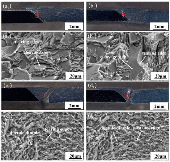 Figure 8 shows the fracture location and morphology of the joint under different ultrasonic amplitudes. The fracture of the joint with ultrasonic amplitudes of 0 and 4.8 μm began at the weld seam and extended to the interface reaction zone at the steel side, as shown in Figure 8a1 and Figure 8b1. The Al-Si eutectic phase in the weld seam presented a long strip shape, and the thickness of the IMCs at the interface was large under these parameter conditions. These two brittle and hard compounds are prone to becoming crack sources, causing fracture of the joint. Figure 8a2 and Figure 8b2 present a typical mixed fracture with cleavage steps and tearing edges.