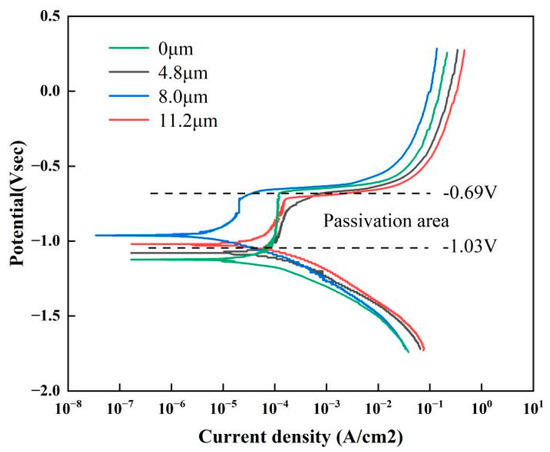 Figure 9 shows the dynamic potential polarization curves of the joint in a 3.5% NaCl solution under different ultrasound amplitudes. The self-corrosion potential Ecorr and self-corrosion current density Icorr were measured by fitting the polarization curves using the Cview software (version 3.0), and the parameters of the corresponding electrochemical measurements are listed in Table 4. From Figure 9, it can be seen that the joint passivated multiple times during the corrosion process, with a passivation zone ranging from −1.03 V to −0.69 V. This was attributed to the slow dissolution rate of the passivation film on the surface of the joint during the early stage of corrosion. As the corrosion potential and corrosion current increased, the dissolution rate of the passivation film increased, and the passivation film began to rupture. The self-corrosion potential reflects the difficulty or ease of corrosion in the joint, and the larger the self-corrosion potential, the less likely the corrosion is. The self-corrosion current density reflects the actual corrosion rate of the joint during the corrosion process; the lower the corrosion current density, the lower is the corrosion rate [26,27]. From Table 4, it can be observed that as the ultrasound amplitude increased from 0 μm to 11.2 μm, the self-corrosion potential of the joint first increased and then decreased, whereas the self-corrosion current density first decreased and then increased. When the ultrasonic amplitude was 8.0 μm, the self-corrosion potential was a maximum of −0.9623 V, the self-corrosion current density was a minimum of 3.9032 × 10−6, and the corrosion resistance of the joint was optimal. Under this condition, the grain size of the joint was the smallest. The refinement of grains increased the number of grain boundaries per unit volume, which resulted in more active sites at the grain boundaries participating in corrosion reactions. These active sites can effectively hinder the infiltration of corrosive agents, thereby improving the corrosion resistance of the joint [28,29]. In addition, fine grains can reduce the stress concentration to prevent crack formation and propagation, which indirectly improves the corrosion resistance.