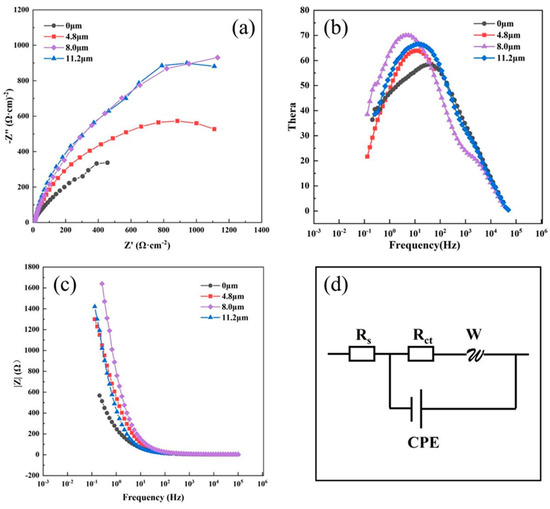 The relationship between the phase angle and the frequency of the Bode is shown in Figure 10b. The capacitive arc in the low-frequency region was generated by surface corrosion of the electrode, and the phase angle increased first and then decreased slightly with the increase in ultrasonic amplitude. Some scholars have pointed out that a larger phase angle implies a more homogeneous current distribution and lower corrosion rate [33]. When the ultrasonic amplitude was 8.0 μm, the phase angle of the joint reached the maximum, which suggested that the corrosion resistance of the joint was optimal.