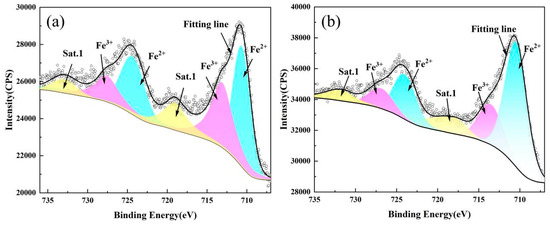 Fe element XPS fine spectrum in the passivation film: (a) without ultrasonic vibration; (b) with the ultrasound amplitude of 8.0 μm.