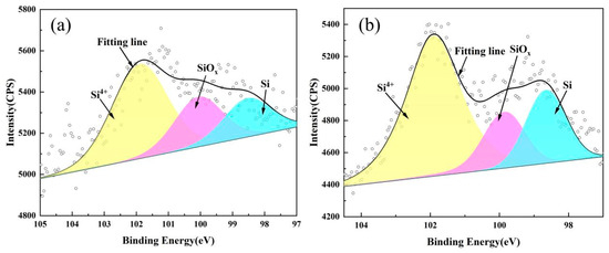 Si element XPS fine spectrum in the passivation film: (a) without ultrasonic vibration; (b) with the ultrasound amplitude of 8.0 μm.