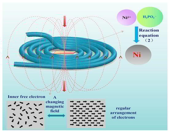 The use of large quantities of corrosive or toxic chemicals poses many problems for environmental protection related to waste liquids [,,], and the whole treatment process is dangerous for the operators []. Achieving environmentally friendly pretreatment is in line with the development trend of chemical plating. The electromagnetic induction activation heating process proposed in this paper (Figure 1) excludes the use of corrosive chemicals to remove the surface of the oxide film. In the case of the substrate surface, it helps to prepare a layer of strong bonding and uniform distribution of the activated nickel layer. The resulting nickel nanoparticles are the catalytic centre of the EPN chemical plating and ultimately provide the strong bonding of a nickel-plated layer [,,,]. In this paper, a new activation process is proposed, which not only makes the operation easier but also reduces the pollution to the environment, providing a new direction for the surface treatment of materials.