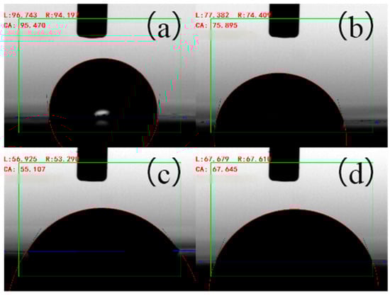 Figure 3a shows the hydrophilicity test results of the substrate before de-oiling—the water contact angle is 95.47°, the shape of the water droplets is round, the cohesion of water droplets is good, and there is no diffusion phenomenon. This indicates that a waterproof oil film is attached to the surface of the substrate, which will affect the adsorption of activation particles on the substrate during immersion, and will also affect the activation effect and the bonding force of the plating layer. Figure 3b–d shows the hydrophilicity test results of the substrate surface after de-oiling with anhydrous ethanol, a mixed solution of sodium hydroxide + sodium bicarbonate + sodium phosphate, and an aqueous acetone solution, respectively. It can be seen that the water contact angle is not the same after using different oil-removing liquids: the water contact angle of Formula Ⅰ decreased to 75.90°; Formula Ⅱ decreased to 55.11°; and Formula Ⅲ decreased to 67.65°. It was found that Formula Ⅱ had an obvious oil-removing effect, and the shape of the water droplets was flat, among which alkaline oil-removing liquids prepared with sodium hydroxide, sodium bicarbonate, and sodium phosphate in a certain proportion showed the best oil-removing effect. The alkaline degreasing liquid formulated with sodium hydroxide, sodium bicarbonate, and sodium phosphate in a certain proportion has the best degreasing effect.
