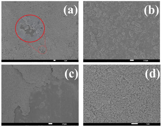 In the activation process, three main activation factors are considered (heating temperature, ion concentration ratio, spray rate), and different activation parameters will lead to a different quality of the activation layer. As shown in Figure 4a, activation under the conditions of slow spray rate, low ion concentration, and moderate temperature resulted in the activation layer not completely covering the surface of the substrate, which is due to the following reasons: the activation solution is evaporated by the high temperature in the process of spraying, resulting in the activation solution falling on the surface of the substrate less. The ion concentration ratio is insufficient, which leads to the nickel particles on the surface of the substrate reducing, resulting in the substrate not being completely covered and the activation effect being worse. As shown in Figure 4b, under the condition of a moderate spray rate, the activation layer will have a different quality if the different activation parameters are used. With a moderate spray rate, moderate ion concentration, moderate temperature conditions of activation, the activation of the activation layer of nickel particles is distributed uniformly and continuously. The reason for this is that the moderate spray rate can allow the appropriate amount of activation solution to fall to the surface of the substrate and the ion concentration ratio to meet the reaction equation; the temperature being moderate can also provide energy for the reactive reaction. As Figure 4c shows, in the conditions of activation, resulting in a large area of activation layer cover, there are cracks. The reason for this is that the activation solution is evaporated by the high temperature, the ion concentration is low, leading to nickel particles between the gap being large, and the bonding force is not strong. As shown in Figure 4d, if the spray rate is fast, the ion concentration is high, and the temperature is moderate under the condition of activation, the surface of the substrate nano-particle stacking is too much, which will affect the subsequent application of the plating, resulting in a decline in the quality of the plating layer.