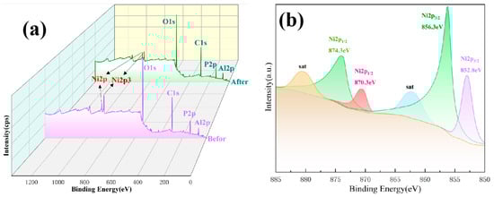 To further verify the experimental conclusions, the activated aluminium alloy surface was examined using XPS. As shown in Figure 6, the comparison of the fitted full spectrum (Figure 6a) shows that there are orbital peaks of Ni2p before and after ultrasonic cleaning, which proves that the activated layer has a strong binding force. The orbital peaks of Ni2p, P2p, O1s, and C1s appeared on the surface of the substrate after ultrasonic cleaning, respectively. In the Ni spectra shown in Figure 6b, there are two main peaks at 852.8 eV and 870.3 eV, which correspond to the 2p3/2 and 2p1/2 energy levels of Ni, respectively, indicating that there is a metallic nickel attached to the surface of the activated substrate. In summary, this indicates that the new activation process can produce a layer of catalytically active metallic nickel on the surface of the substrate [].