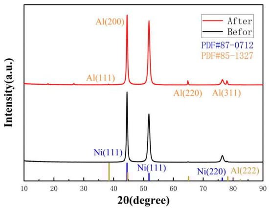 Figure 7 shows the XRD patterns of the aluminium alloy before and after the comparison of activated ultrasonic cleaning, from which it can be seen that before ultrasonic cleaning, three strong peaks can be observed at 2θ about 44.5°, 51.8°, and 76.4°, which are the crystallographic diffraction peaks of (111), (200), and (220) of Ni, respectively (PDF#87-7012). After ultrasonic cleaning, not only were the diffraction peaks of Ni detected but also the diffraction peaks of Al at 2θ about 38.5°, 44.7°, 65.1°, 78.2°, and 82.4°. However, the diffraction peaks of Al were masked by the diffraction peaks of Ni, indicating that the activation layer on the surface of the aluminium alloy before and after ultrasonication had no obvious change, and the bonding force was strong. From the space group, it can be seen that the nickel particles in the activation layer have a face-centred cubic crystal structure, and the peaks have sharp peak shapes, indicating that the product crystallization is complete and also indicating that the process does not change the crystal structure.