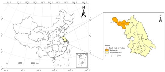 Tomb No. 2 of Tushan is situated at the northern foot of Yunlong Mountain in Xuzhou, and it represents the principal tomb of the Tushan Han tomb group (Figure 1). It is postulated that this may be the tomb of the first or second king of Chu, with an estimated age of approximately 2000 years. At present, it is the most well-preserved and information-rich, large-scale tomb of an Eastern Han dynasty feudal king that has been discovered in China, which has led to its designation as one of the “Top Ten Archaeological Discoveries in China for 2020”.