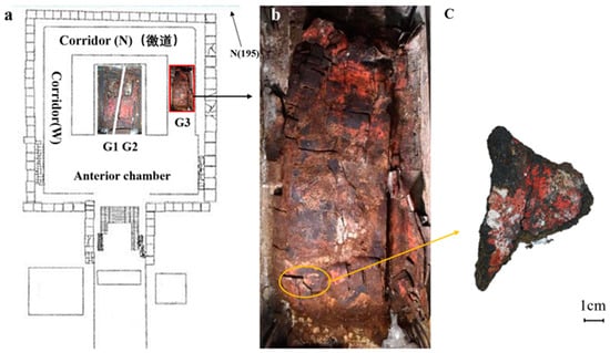Position of the coffin and sample: (a) schematic diagram of the location of the coffin(G1,G2,G3 are the abbreviation for coffin number); (b) current excavation status of the coffin; and (c) the experimental sample.