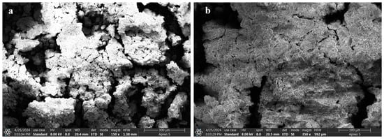 The results, as illustrated in Figure 4, indicate that the pigment layer has a loose surface structure with numerous fine cracks, within which some particulate matter was embedded, suggesting poor preservation. The EDS analysis (Table 1) revealed that the pigment layer contained significant amounts of mercury and sulphur, with concentrations of 34.6% and 7.1%, respectively. This led to the conclusion that the red pigment is cinnabar (HgS). The elevated levels of carbon and oxygen were presumably attributable to the residual organic binders employed in the manufacturing of the pigment layer [8].