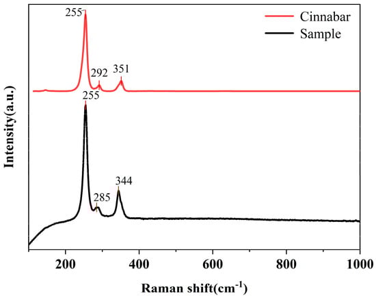 As illustrated in Figure 5, the three distinctive peaks at 255 cm−1, 285 cm−1, and 344 cm−1 exhibited a high degree of similarity to the Raman scattering peaks of the cinnabar (HgS) standard sample (255 cm−1, 291 cm−1, and 351 cm−1) [9]. This corroborates the hypothesis that the red pigmentation observed in the layer is cinnabar (HgS). This conclusion is also consistent with the results obtained from the EDS analysis.