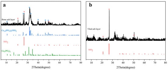 The XRD patterns: (a) bone ash layer(‘*’ Corresponding to the characteristic peak of SiO2; ‘*’ Corresponding to the characteristic peak of Ca10(PO4)6(OH)2); (b) tiled ash layer(‘*’ Corresponding to the characteristic peak of SiO2).