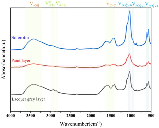A LUMOS (Bruker, Bremen, Germany) Fourier transform infrared spectrometer was employed for this purpose. The specific testing conditions included a wavelength range of 4000 to 500 cm−1, 24 scans, and a resolution of 4 cm−1. Then, a 1~4 mg pigment layer, a tiled ash layer, and bone ash layer sample powders were prepared separately, which were then mixed and grinded with 200–400 mg of dry KBr for tablet preparation.