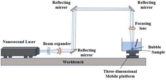 In order to realize the laser-induced cavitation bubble microtexture test, a laser-induced cavitation bubble test platform was built, as shown in Figure 1. The laser source used was an Nd:YAG solid-state pulse laser (Beamtech, Beijing, China, NimmaExtra), with a laser wavelength of 1064 nm, a pulse width of 9 ns, and a repetition frequency of 5 Hz. After the laser beam is expanded 4 times, it is directed through a reflected light path and finally focused vertically by a convex lens into a transparent water tank made of acrylic, which has a high light transmittance and measures 100 mm × 100 mm. The water tank is placed on a three-dimensional mobile platform (Zolix, Beijing, China, CZF20-120), with an adjustable range of 100 mm. The precision of the X and Y axes is 0.1 mm, and the precision of the Z axis is 0.05 mm.