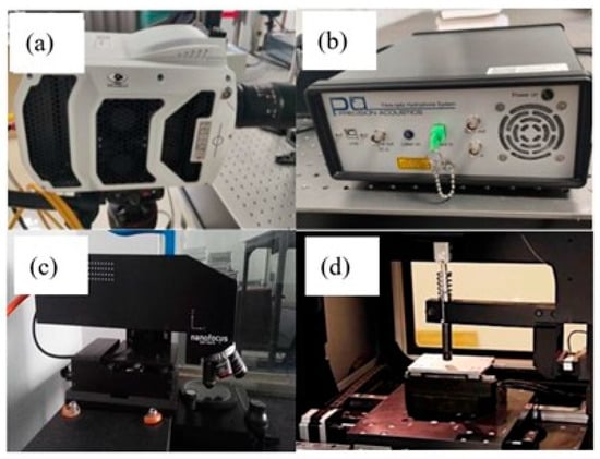 Test equipment: (a) high-speed camera, (b) fiber optic hydrophone, (c) confocal microscope, (d) friction and wear testing machine.