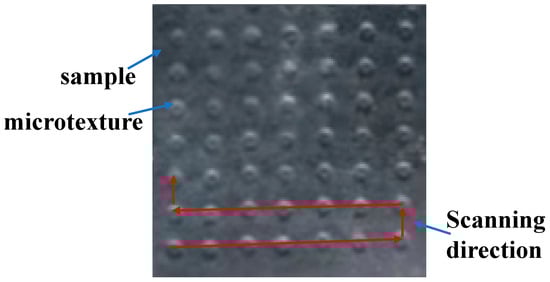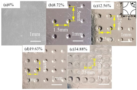 In order to study the technology of the laser-induced cavitation bubble forming microtexture, samples with microtexture densities of 0%, 8.72%, 12.56%, 19.63%, and 34.88% were prepared for testing. The three-dimensional moving platform was adjusted to move the laser focus position and form multiple micropits, thereby creating the microtexture, as shown in Figure 3. The surface morphology of the microtexture was analyzed to verify the feasibility of the process and obtain the optimal process parameters.