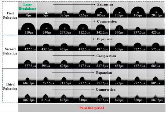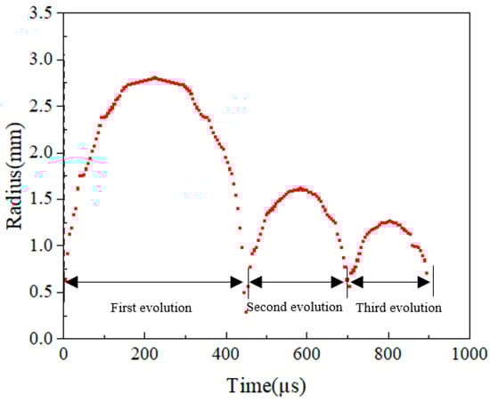 The evolution of a cavitation bubble induced by laser with an energy of 400 mJ is shown in Figure 4. The cavitation bubble induced by the laser exhibits three evolution periods, and the total duration of these three evolution periods is 887.5 μs. At 0 μs, the laser breaks down the local liquid, and high-temperature and high-pressure plasma [] is formed on the surface of the material. Promoted by the solid–liquid pressure, the cavitation bubble begins to expand near the wall. However, the existence of the solid wall causes the cavitation bubble to expand in a hemispherical shape, and then the cavitation bubble enters the evolution process. The first evolution period is from 5 μs to 420 μs, with a total duration of 415 μs. The second evolution period is from 422.5 μs to 685 μs, during which an irregular hemispherical cavitation bubble is formed. The third evolution period is from 687.5 μs to 887.5 μs. The durations of the second and third evolution periods are shortened to 262.5 μs and 200 μs, respectively. After the cavitation bubble experiences these three evolution periods, it eventually collapses and dissipates in the liquid. The relationship between the size of the cavitation bubble and time induced by a laser energy of 400 mJ is shown in Figure 5. It can be seen from Figure 5 that the maximum radius of the cavitation bubble decreases with the increase in the number of evolution periods. The maximum radius of the cavitation bubble in the first evolution period is 2.8 mm, and the maximum radii of the cavitation in the second and third evolution periods are 1.61 mm and 1.26 mm, respectively. The decline rates gradually slow down to 42.5% and 21.74%, respectively. It can be inferred that the energy of the cavitation bubble decreases with the number of evolution periods, and most of the energy of the cavitation bubble is consumed during the first evolution process.