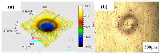 After laser-induced cavitation bubble impact, a micropit was formed on the surface of the sample. The morphology of the micropit was observed by confocal microscopy, as shown in Figure 7. The surface of the micropit formed by laser-induced cavitation bubble has no ablation generated, which can be seen in the combination of Figure 5 and Figure 6. The micropit is formed under the combined action of the plasma shock wave and the first period collapse shock wave, and the impact of shock waves generated by other evolution periods is small, which proves the feasibility of laser-induced cavitation bubble formation for micropit.