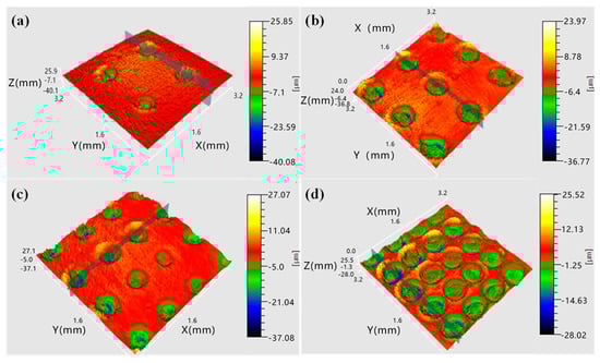 The three-dimensional morphology of the sample surface observed by a confocal microscopy is shown in Figure 9. It can be seen from Figure 9 that microtexture edges of different densities have small protrusions. When the density of microtexture is 34.88%, the protrusions may affect the edge morphology of surrounding micropits, resulting in defects. When the densities of microtexture are 8.72%, 12.56%, and 19.63%, the microtexture surface morphology is flat, and the protrusions do not affect the adjacent micropits. No cracks are found at the micropits boundary, which proves that laser-induced cavitation can form microtexture with good surface morphology.