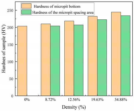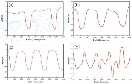 The two-dimensional cross-sections of samples with varying microtexture densities are shown in Figure 10. As evident from Figure 10, there is no significant change in the size of micropits within the same density level. For the sample with a density of 8.72%, the diameter of the micropits is approximately 478 μm, and the average depth is 18.25 μm. As the density of microtexture increases, the diameter of the micropits generally exhibits an increasing trend, whereas the depth shows a decreasing trend. At densities of 19.63% and 12.56%, the size of the micropits changes minimally, with a diameter of approximately 578 μm and an average depth of approximately 13.56 μm. As shown in Figure 11, the hardness at the bottom of the micropits increases with density. This could be attributed to the introduction of compressive stress during the formation of adjacent micropits, leading to local strengthening of the sample and inhibiting the downward growth of the micropits, directing micropits’ expansion towards the surrounding areas instead. However, when the density increases from 12.56% to 19.63%, the diameters of the micropits decrease. Combining this with Figure 11, it is apparent that at a density of 19.63%, the hardness of the spacing area between micropits increases significantly. This may stem from the decreased distance between micropits and the increased extrusion forces between them. According to Figure 10d, when the density is excessively high, the presence of adjacent micropits significantly impacts the topography of the micropits. The depth of the micropits becomes less than 10 μm, and even stratification and distortion are observed.