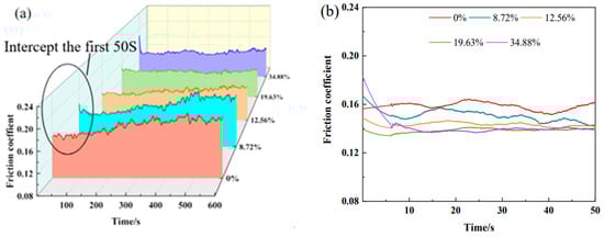 The variation of the friction coefficient is shown in Figure 12a. The evolution of the internal friction coefficient during the first 50 s of the running-in period is shown in Figure 12b. It is evident from Figure 12b that the friction coefficients of the five groups of samples are initially very high and exhibit a pronounced decline within the first 5 s. This can be attributed to the presence of small protrusions and indentations on the sample surface, leading to a reduced actual contact area and a significant increase in the friction coefficient. As time progresses and the grinding effect of the friction pairs takes place, the protrusions gradually diminish, the sample surface becomes smoother, and the wear rate gradually decelerates. The test reaches a stable wear stage within 50 s, characterized by a significantly reduced wear rate and a relatively stable friction coefficient, which persists until the sample fails or the test concludes.