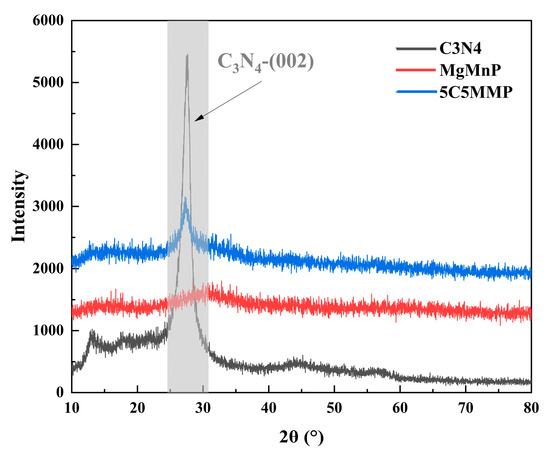 The XRD analysis, depicted in Figure 2, highlighted the patterns for C3N4, MgMnP, and 5C5MMP. Notably, the XRD curve of C3N4 demonstrated the typical carbon nitride peaks in the 2θ range of 25–30°. The intense peak was attributed to the 002 crystal plane of carbon nitride, as identified by the standard crystal reference PDF: 87-1526 [40]. In the case of MgMnP, the XRD analysis showed an absence of sharp diffraction peaks, with only a broad, amorphous-like peak detected in the 2θ range of 25–35°, confirming its amorphous characteristics. While the characteristic peak of C3N4 (25–30°) could still be identified in the 5C5MMP composite, its intensity had been notably weakened. Undoubtedly, the decrease stemmed from the presence of MgMnP in the composite material. Additional insights were derived from the XRD analysis of composite materials with varying ratios, as shown in Figure S3. Figure S3 revealed that as the mass fraction of MgMnP in the composite increased, the (002) crystal plane peak of C3N4 progressively weakened, while the XRD pattern increasingly resembled that of MgMnP. These findings clearly confirmed that all the composite materials consisted of MgMnP and C3N4.
