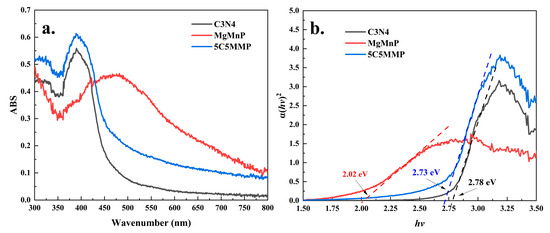 The UV-Vis diffuse reflectance spectra (a) and band fitting results (b) of C3N4, MgMnP, and 5C5MMP materials.