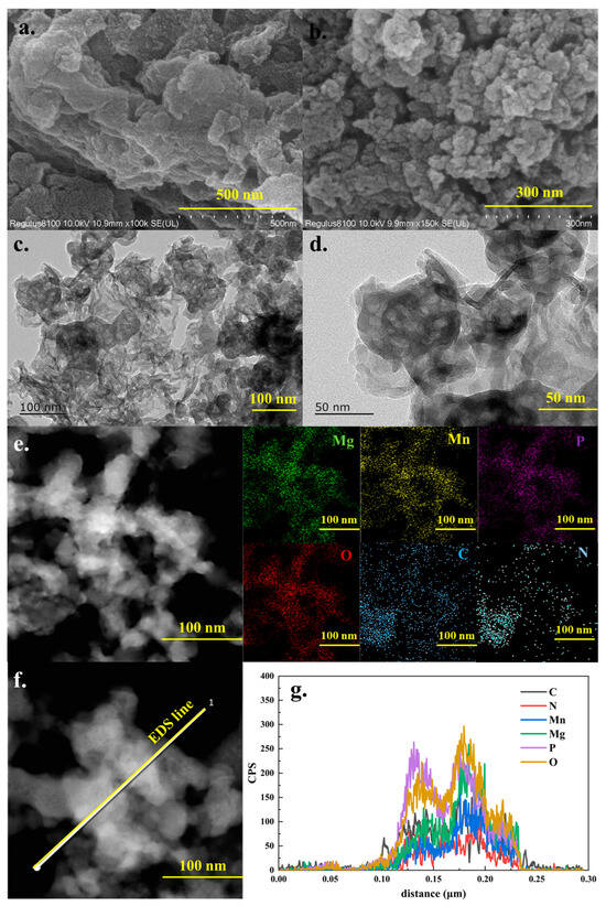The SEM (a,b) and TEM (c,d) morphology analysis results of 5C5MMP composite; the TEM-EDX elemental mapping analysis results of the 5C5MMP composite (e); the TEM-EDX elemental line analysis results of the 5C5MMP composite (f,g).