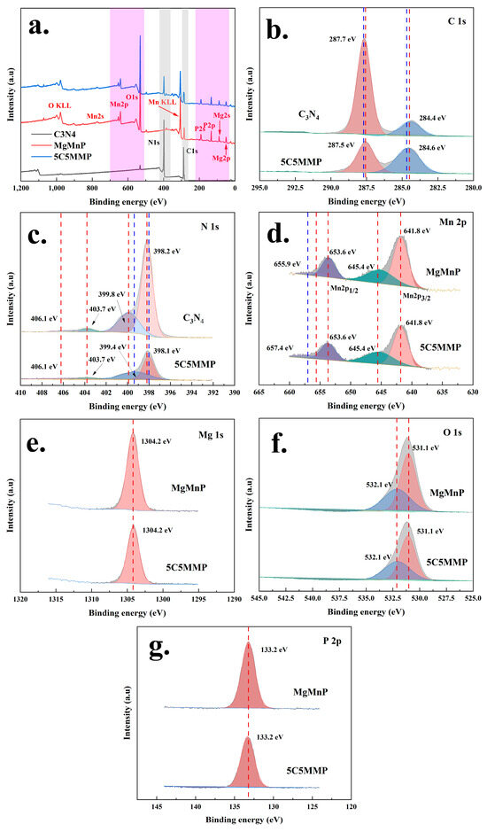 The XPS analysis results of C3N4, MgMnP, and 5C5MMP materials: full spectrum scanning (a); high resolution XPS of C1s (b), N1s (c), Mn2p (d), Mg 1s (e), O 1s (f), and P 2p (g).
