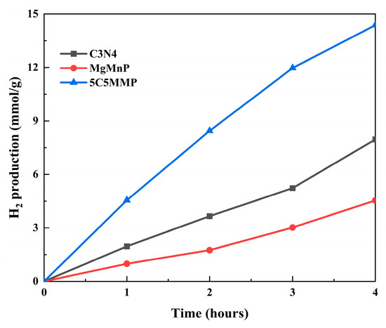 The photocatalytic hydrogen evolution results of C3N4, MgMnP, and 5C5MMP materials.