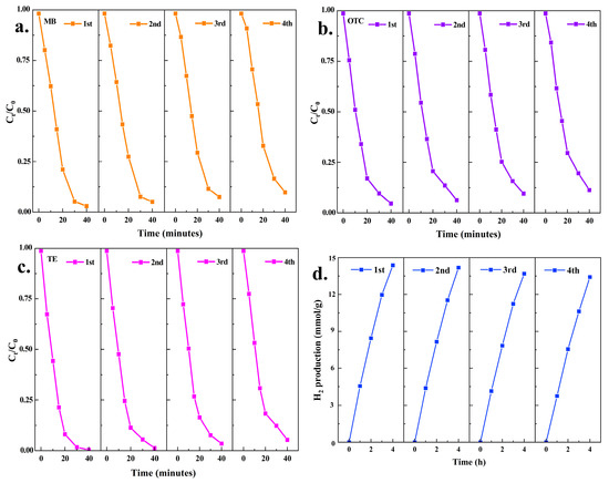 The results of photocatalytic recycling performance of the 5C5MMP composite ((a): degradation of MB; (b): degradation of OTC; (c): degradation of TE, and (d): the hydrogen evolution).