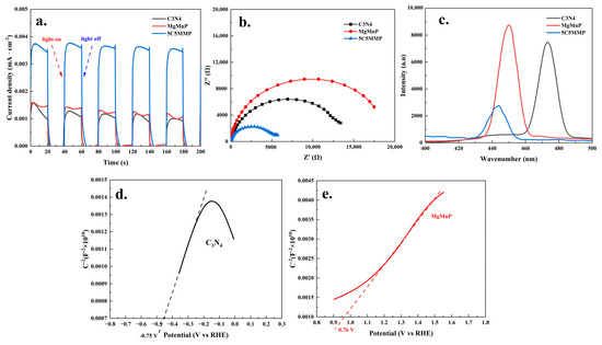 The photocurrent (a), electrochemical impedance (b), solid-state fluorescence (c), and Mott–Schottky (d,e) analysis results of C3N4, MgMnP, and 5C5MMP materials.