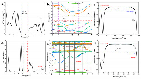 The density of states (a,d), band structure (b,e), and work function (c,f) of C3N4 and MgMnP materials.
