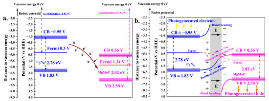 The S-scheme heterojunction interface photocatalytic mechanism of composites of C3N4 and MgMnP. (a) Before contacting; (b) After contacting.