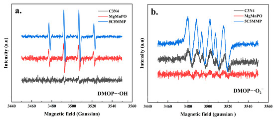 The ESR spectra of radical adducts trapped by DMPO-∙O2− and DMPO-∙OH under visible light for 10 min. (a) hydroxyl radicals; (b) superoxide radicals.