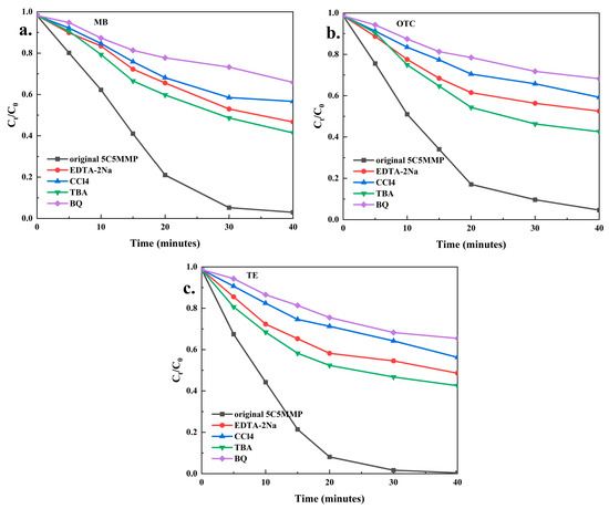 The influence of free radical scavengers on the degradation efficiency of pollutants ((a): MB, (b): OTC, and (c): TE).