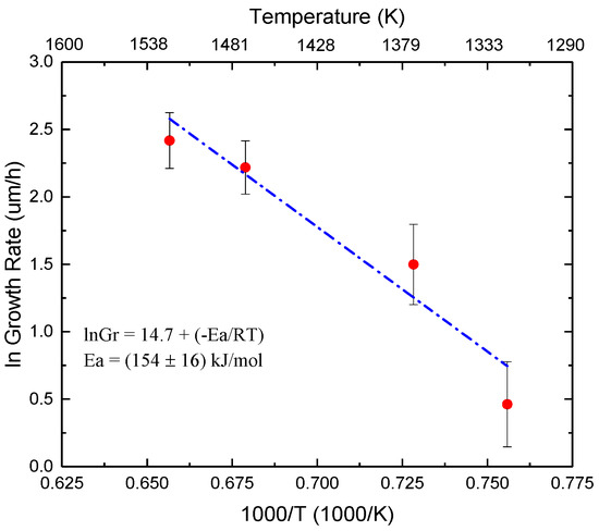 The deposition rate increases proportionally with the deposition temperature following the Arrhenius law (Figure 1), indicating that the growth is limited by the chemical kinetics. The growth rate value of the film grown at 900 °C has been removed since nucleation in the gas phase was observed, providing an artificially high value of the growth rate. Given the standard deviation of the growth rate values at each deposition temperature, the activation energy is estimated as (154 ± 16) kJ/mol for the deposition temperature range of 1050 °C–1250 °C. Similar values are also given for the growth of polycrystalline 3C-SiC on Si (100) (140 kJ/mol) [21] and graphite (108 kJ/mol) [16] substrates using the chemical system Si-C-Cl-H. Thickness was found to increase from the center to the edge of the wafer with an estimated thickness variation of 600 nm for a 1.5-micrometer-thick film, grown at 1100 °C, and 260 nm for a 680-nanometer-thick film, grown at 1050 °C. This is coherent with the fact that the wafer edges are hotter than the center of the wafer due to the heating system. The temperature difference is experimentally estimated to be 15 °C. For these films, the uniformity—estimated for a central wafer area of 2.7 cm and 1.2 cm diameter—is, respectively, 13% and 5% for the 1100 °C film and 10% and 5% for the 1050 °C film.