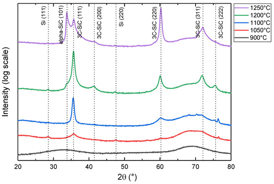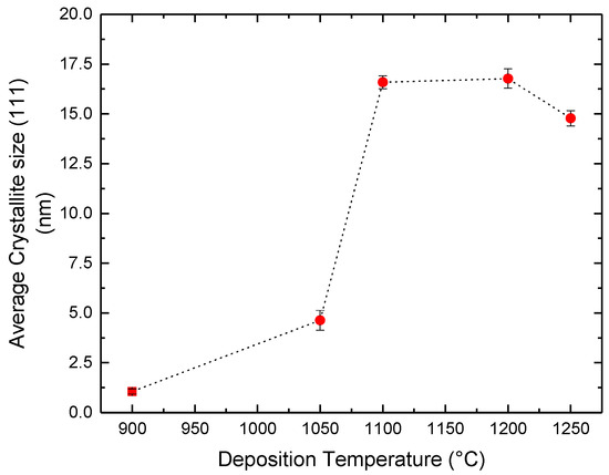 For the deposition temperatures 1050 °C to 1100 °C, spherical-shaped grains are observed (Figure 5) on the films’ surfaces. A similar morphology of spherical-shaped agglomerates is observed for the sample at 900 °C. These agglomerates are attributed to a nucleation in the gas phase close to the substrate surface. Faceted SiC grains are observed for deposition temperatures higher than 1100 °C. Our observation shows that the grain size is increasing from 1050 °C to 1250 °C. Similar results, in terms of surface morphology, have been found in previous reports for polycrystalline SiC and polycrystalline Si films [16,20,37,41,42,44]. The increase in grain size is also in agreement with the corresponding increase in the crystallite size given in our XRD results.