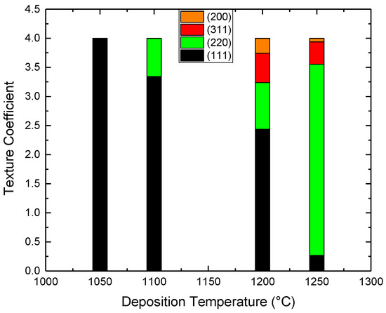 In order to obtain a better understanding of the evolution of the crystalline structure with the deposition temperature, the texture coefficient has been calculated for all samples, except 900 °C, as shown in Figure 3. The deposition temperature has a strong impact on the texture of the grown polycrystalline material. Lower temperatures produce films with (111) preferential orientation; however, a change in the preferential orientation from (111) to (220) mainly—but also to (311) and (200) at a lesser degree—is observed for films deposited at 1250 °C. Such changes in preferential orientation with the increased temperatures are also observed in previous reports for chlorinated chemistries of LPCVD [13,16,38] and could be attributed to a twin-mediated growth mechanism according to [13]. Indeed, all these studies have shown the existence of twin planes of <110> orientation [13,16,38]. This mechanism is activated for a decrease in the supersaturation and an increase in the deposition temperature due to the enhancement of the adatoms’ surface mobility and due to the lower nucleation frequency [13].