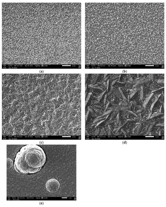 SEM images: surface morphology of n-doped polycrystalline SiC grown at (a) 1050 °C, (b) 1100 °C, (c) 1200 °C, (d) 1250 °C, and (e) 900 °C.