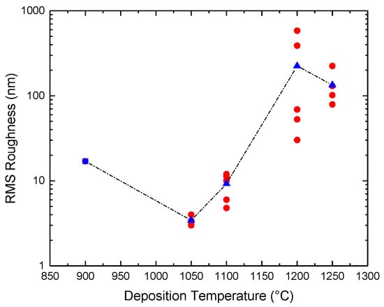The RMS surface roughness, determined by optical profilometry, was found to increase proportionally from 1050 °C to 1250 °C (Figure 6). The increased roughness is related to an increased grain size (Figure 5) and crystallite size (Figure 4), in agreement with [19,24,38,42]. Therefore, the growth conditions favoring large grains also favor high surface roughness. The increased RMS roughness measured for the films grown at 900 °C is probably due to the presence of agglomerates (see Figure 5e) rather than the actual roughness itself. According to the initial requirements, deposition temperatures of 1050 °C–1100 °C provide appropriate surfaces for MEMs and neural-interface fabrication, respectively. Surface roughness uniformity for 900 °C to 1200 °C was found to be 10%–40%, while for films grown at 1250 °C, the roughness shows a lower uniformity of 3%–5%. No clear evolution has been observed between the centers and the edges of the wafers.