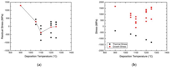 To further investigate the effect of deposition temperature on the stress generated in the polycrystalline SiC films, we first calculated the thermal stress and then extracted the growth stress (Figure 7) [32]. The calculated thermal stress is compressive for all deposition temperatures since the difference between the two thermal expansion coefficients of SiC and Si is negative (CTE(SiC) − CTE(Si) < 0). As long as the thermal stress has a monotonic behavior for our system, the evolution of the growth stress is the reason behind the corresponding evolution of the residual stress with the deposition temperature. The growth stress, as calculated by subtracting the calculated thermal stress from the measured residual stress, was found to be tensile and more or less constant, except for 1100 °C, where the minimum growth stress value was observed.