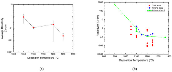 Electrical resistivity of n-doped polycrystalline SiC films and deposition temperature: (a) average electrical resistivity of all wafers vs. temperature; and (b) comparison of our individual values with the available state of the art (References on graph (b): Cheng et al., 2002 [24], Privitera et al., 2015 [26]).