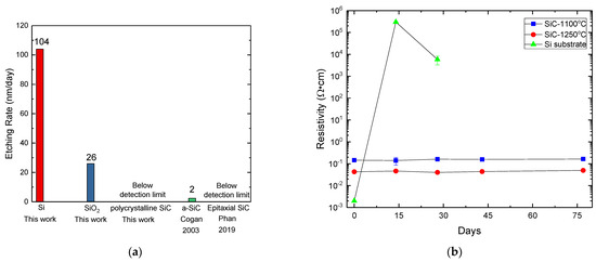 (a) Etching rate for polycrystalline SiC, Si, and thermally grown SiO2 obtained after 77 days of accelerated aging tests in heated 90 °C PBS solution. The data for amorphous SiC are taken from Cogan et al. [27] (154 days in heated 90 °C PBS solution, SiC film thickness of 1 μm). The data for epitaxial SiC are taken from Phan et al. [29] (8 days in heated 96 °C PBS solution with a SiC film thickness of 230 nm); (b) room-temperature electrical resistivity of n-doped polycrystalline SiC films grown at 1100 °C (blue) and 1250 °C (red) in comparison with the Si substrate (green).