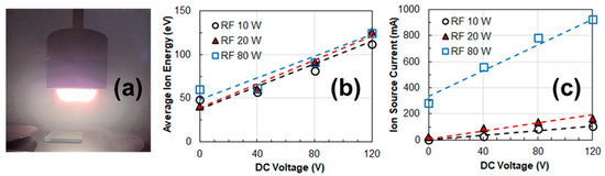 (a) SPR-100 plasma source discharge image with Ar + C4F8 gases; (b) ion energy under the excitation of different DC voltages and RF powers; and (c) ion current under the excitation of different DC voltages and RF powers.